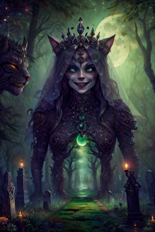 OverallDetail, green theme, moon, path, veil, crown, 1girl, graveyard, giant face in the mist, cat-like beast smiling wide
