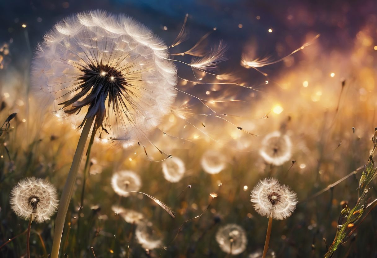 rim lighting, dandelion bent in the wind with its seeds streaming across the screen carried by the wind, silhouette, backlit, field of flowers and grasses bending in the breeze, windy, fireflies, alcohol inks, marbled effect, shallow depth of field, nacreous clouds, ethereal, delicate, extremely detailed, dreamlike