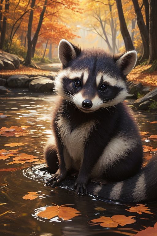 masterpiece, micro, whimsical art, 1 animal, high-quality digital fantasy image of a baby raccoon laying in an autumn forest, autumn leaves, maple trees, floating in a pond, cute, glowing magical, adorable, digital art, kawaii <lora:add_detail:0.9>