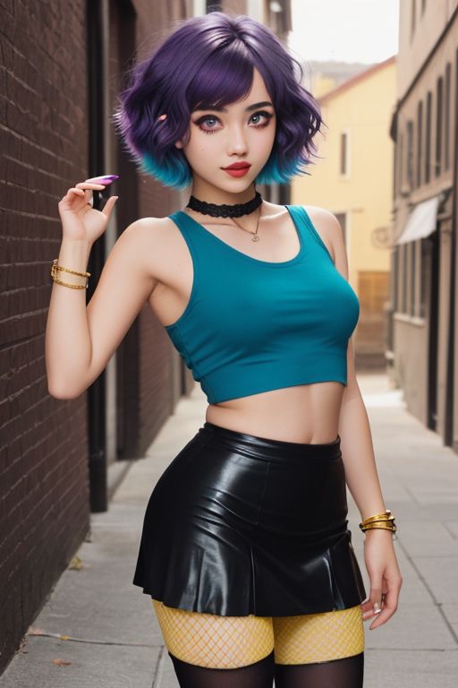 sexy pose, cute pose, 25 yo girl, caucasian girl, a sexy girl in an alley, night, outdoors, ((tiny black micro skirt)), (black pleated skirt), ((yellow tank top)), ((black thigh-high fishnet stockings)), ((yellow combat boots)), ((yellow lace panties)), ((midriff)), (leather bracelet), ((((pinup girl pose))), curious eyes, shy smile, looking at viewer, very small pink areolas, perky nipples, club in background, punk dancers, (((pixie cut))), (((very short hair))), large breasts, perfect face, thin waist, slight abs, long legs, (teal to purple gradient hair), (dark green eyes), ((teal purple ombre hair)), mascara, purple lipstick, pointed eyeliner, purple fingernails, ((CINEMATIC)) (insanely detailed and intricate)