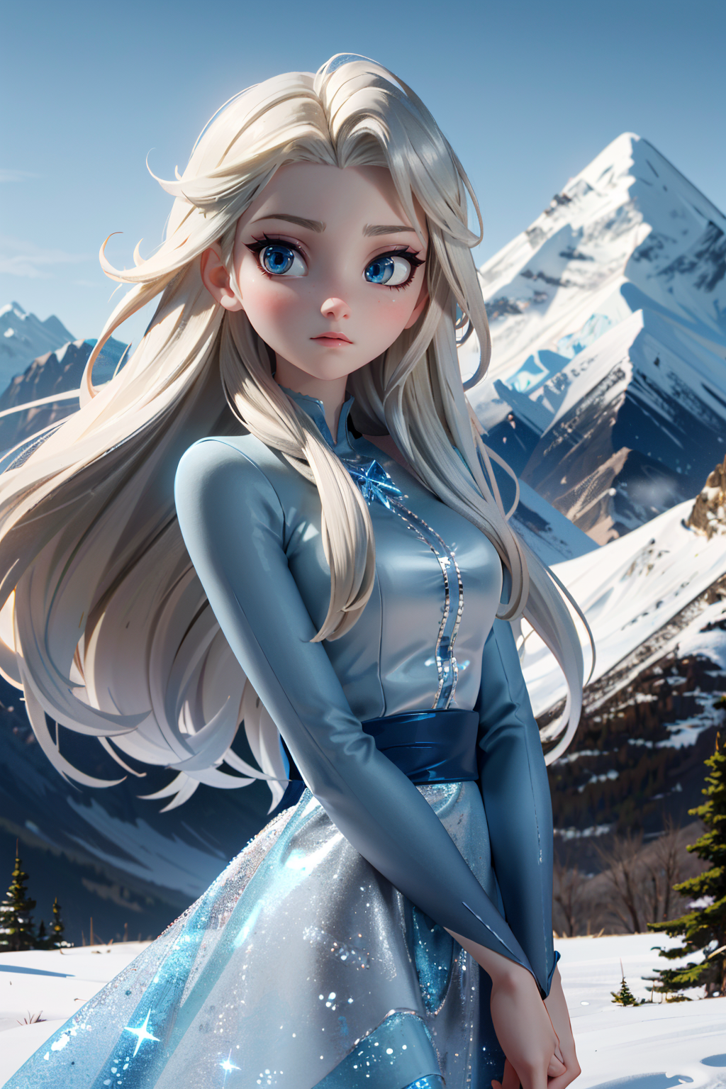 ((ultra detailed, masterpiece, absurdres)) <lora:DisneyElsa:0.8> DisneyElsa, 1girl, long hair, blonde hair, looking at viewer, mountain trail, midday, clear and crisp light illuminating the landscape