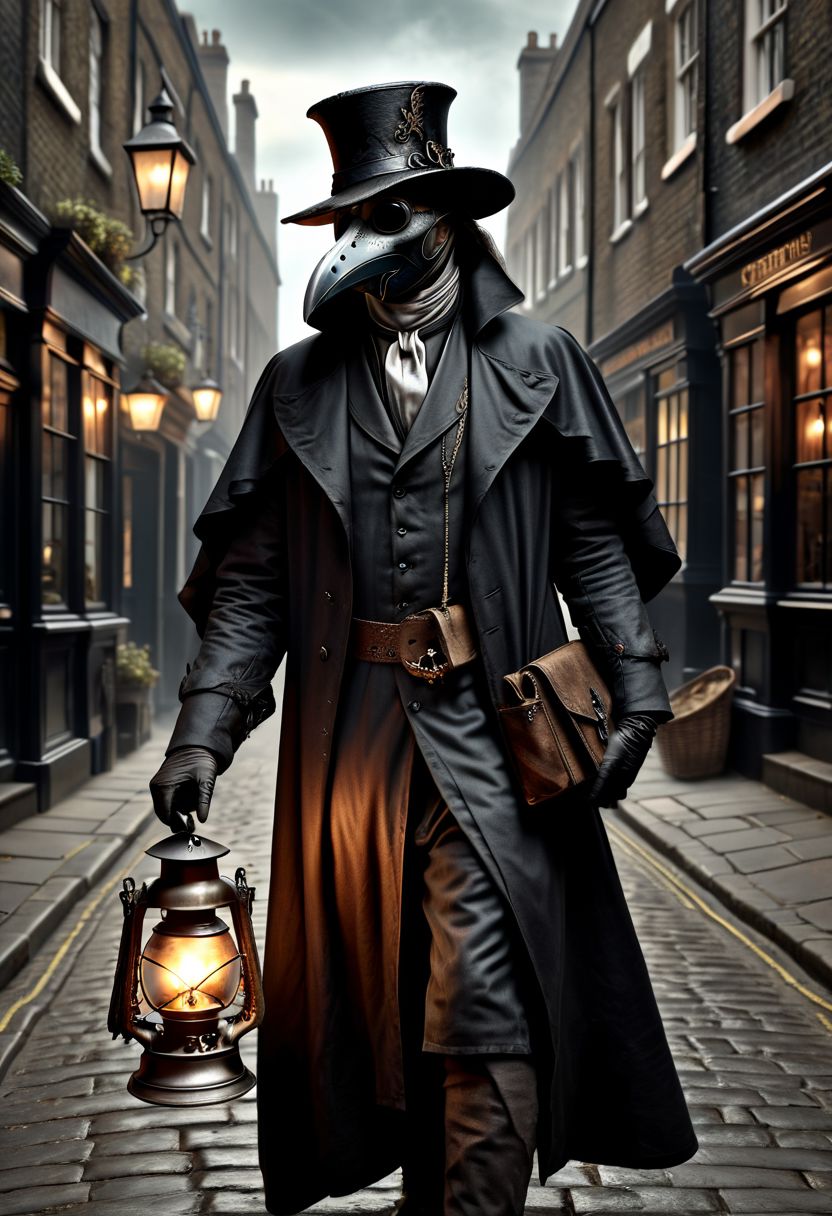 (best quality, 4k, highres, masterpiece:1.2), ultra-detailed, (realistic,photorealistic,photo-realistic:1.37), intricate, victorian style, dark ambiance, HDR, plague doctor, walking in a street, wearing a oil lantern, old street of London, 18th century, hyper detailed, better rendering of the plague doctor mask, leather dark mask