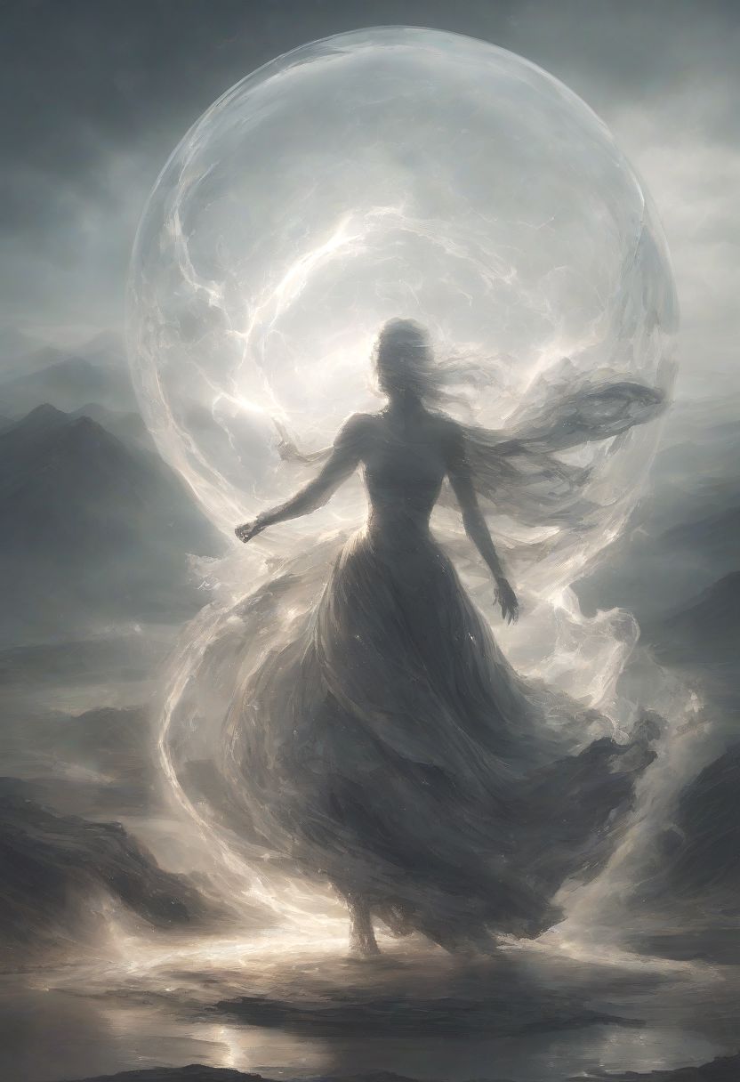 a stormy scene with lightning in the background, in the center of the image is a large glass sculpture of a woman levitating high in the sky, the glass woman is glistening in the sunlight against the storm, inside the glass sphere an air elemental which looks like smoke, the glass woman is levitating in mid air and is surrounded by a veil of smoke, stormy sky with lightning in the background, looking up at the glass sphere with the ground far below, sexy succubus