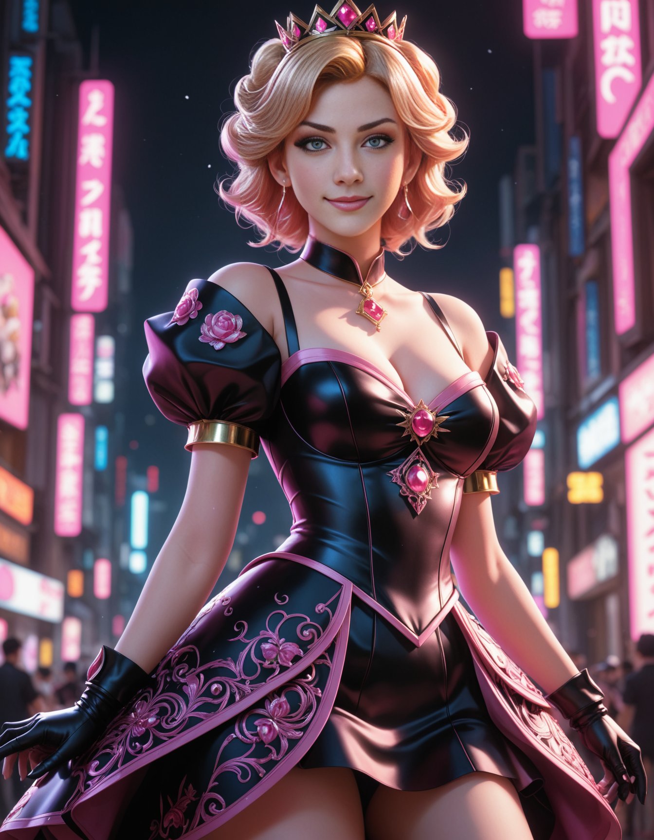 neonpunk style Anime artwork of princess peach in a detailed intricate pink and black dress,by wlop,smile, . cyberpunk, vaporwave, neon, vibes, vibrant, stunningly beautiful, crisp, detailed, sleek, ultramodern, magenta highlights, dark purple shadows, high contrast, cinematic, ultra detailed, intricate, professional
