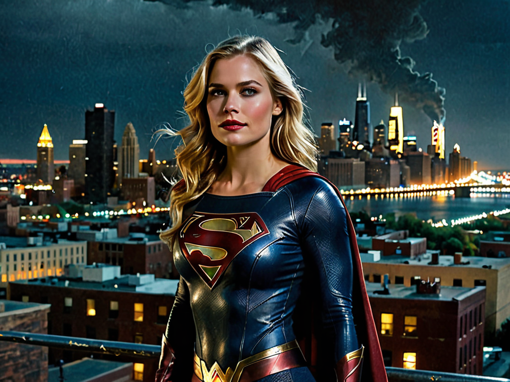 In Casey Baugh's evocative style, Hopeless 2000'S dynamic gorgeous supergirl, standing over a night city skyline, leather straps, hard, worn out, teeth, nose, glowing, Leaning back, she has Blonde hair, she has green eyes, looking over shoulder, key visual, intense, unique, exquisite color, beautiful elegant, positive emotional, original, highly decorated, enchanted, epic composition, confidence