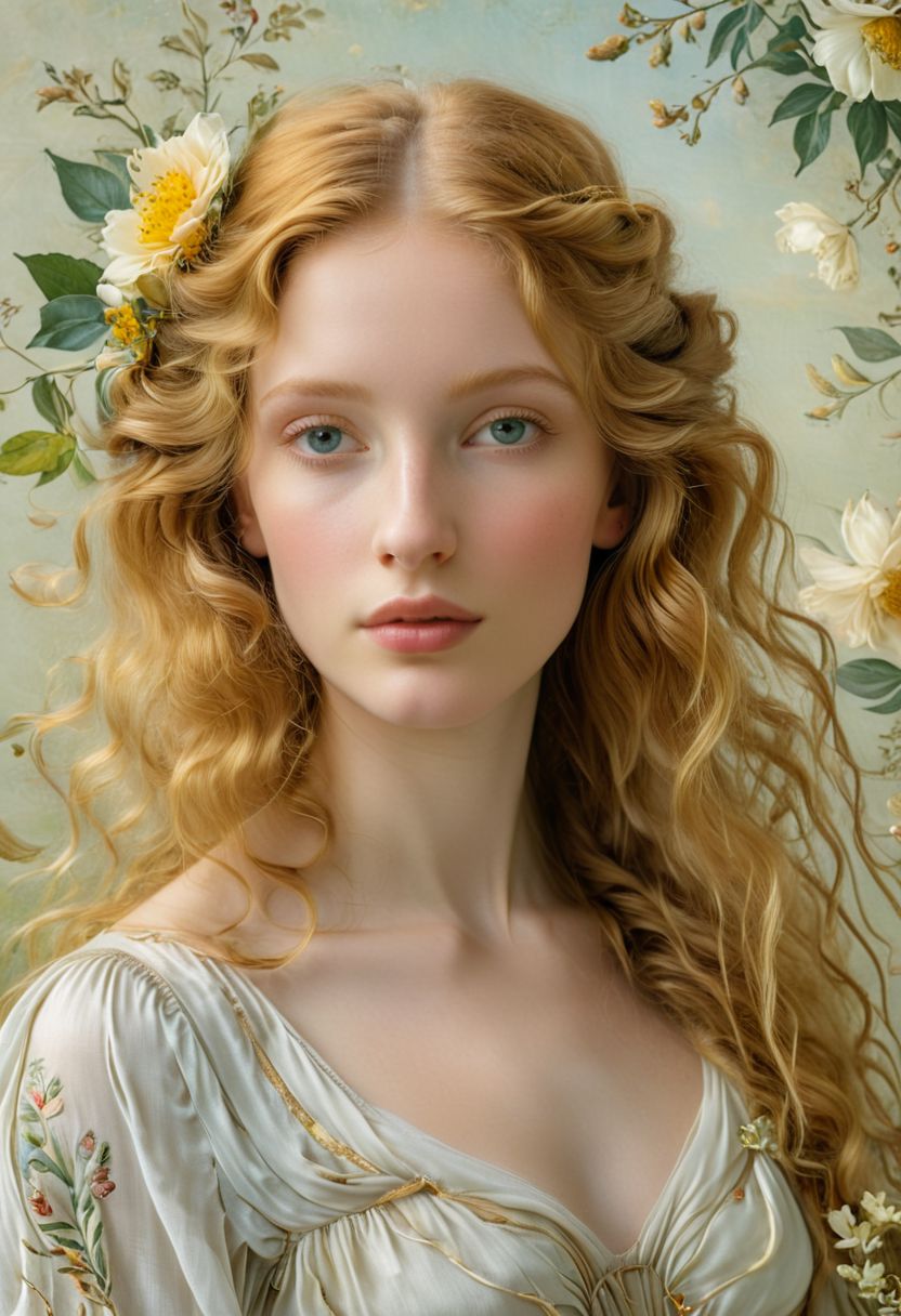 Graceful portrait of a young woman with serene expression, flowing golden hair, and delicate features, set against a soft, natural background with floral elements, conveying a sense of classical beauty, grace, and calm, in the style of Sandro Botticelli, capturing Botticelli's soft lines, ethereal quality, and delicate color palette, with a focus on elegance and harmony. <lora:HighSchoolDxD_PhenexRavel:0.75>, P <lora:windLift_v11:0.8>,
