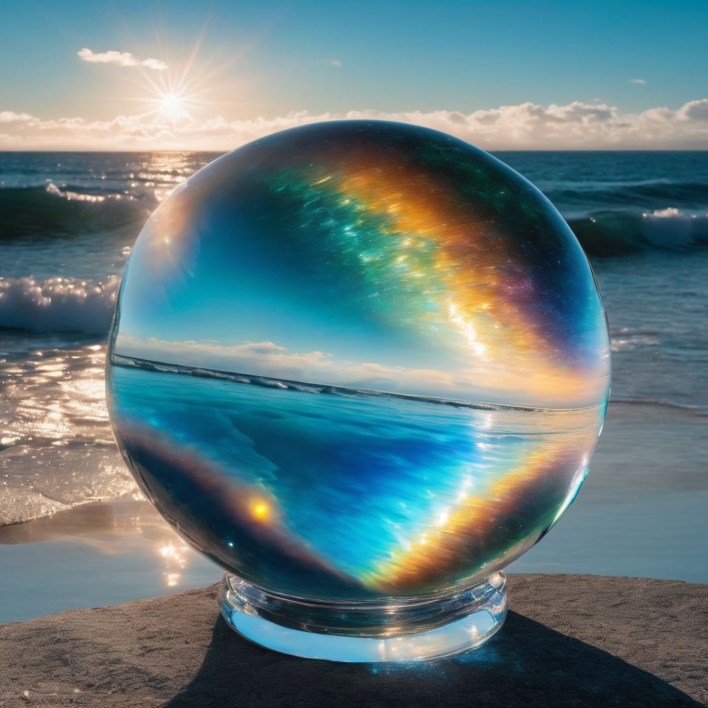 a beautiful soft shimmering rainbow moonstone ball with a mysterious shine lies softly on a light blue velvet cushion, blue lights, iridescent bright colors, opalescent shimmer-effect, in the background the blue-green ocean in the radiant sunlight, reflection, gentle clouds drift by, professional photography, shimmering pink shells, mystery summer, divine presence, ethereal, breathtaking, sunlight illuminating from behind, super resolution, sharp focus, highly detailed, Broken Glass effect, no background, stunning, something that even doesn't exist, mythical being, energy, molecular, textures, iridescent and luminescent scales, breathtaking beauty, pure perfection, divine presence, unforgettable, impressive, breathtaking beauty, Volumetric light, auras, rays, vivid colors reflects