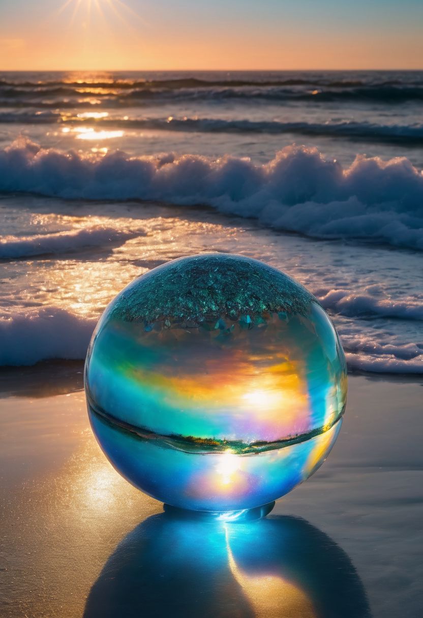 a beautiful soft shimmering rainbow moonstone ball with a mysterious shine lies softly on a light blue velvet cushion, blue lights, iridescent bright colors, opalescent shimmer-effect, in the background the blue-green ocean in the radiant sunlight, reflection, gentle clouds drift by, professional photography, shimmering pink shells, mystery summer, divine presence, ethereal, breathtaking, sunlight illuminating from behind, super resolution, sharp focus, highly detailed, Broken Glass effect, no background, stunning, something that even doesn't exist, mythical being, energy, molecular, textures, iridescent and luminescent scales, breathtaking beauty, pure perfection, divine presence, unforgettable, impressive, breathtaking beauty, Volumetric light, auras, rays, vivid colors reflects