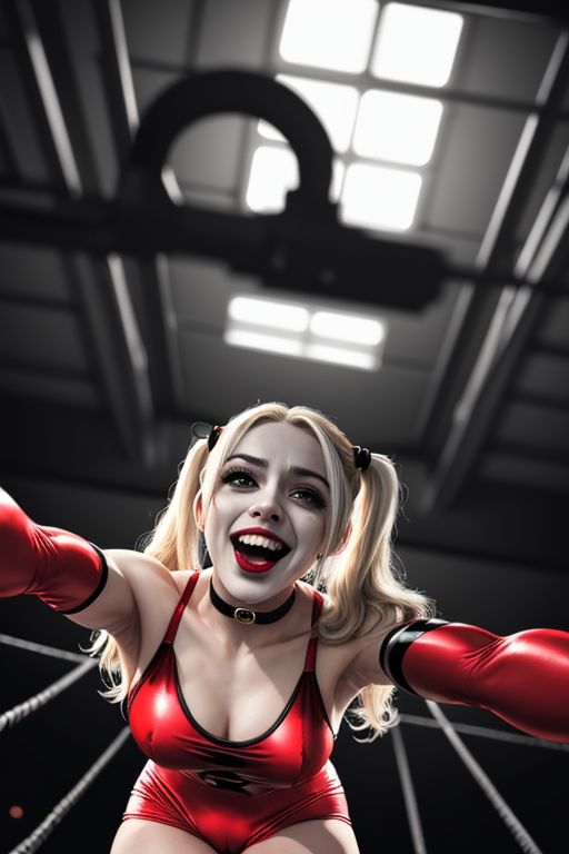 <lora:wrestlers:0.7> harley quinn, (((from below, very low perspective))), (dominant pose), looking down at me, (eye contact), holding handcuffs, pigtails, black and red outfit, arm wraps, black lips, evil dominant laugh, cowboy shot, fighting ring background, solo, masterpiece, high resolution, hd, 8k, shallow depth of field