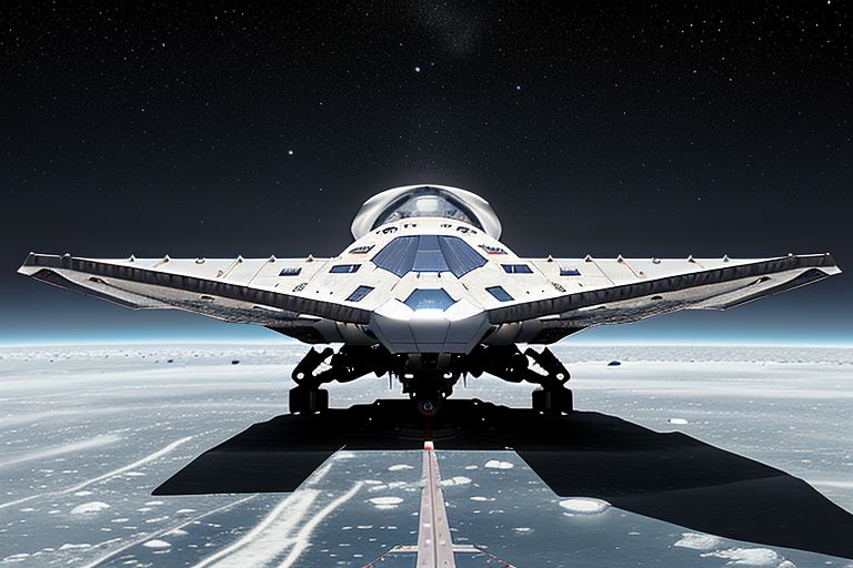 on the surface of europa moon, above the glacier, in cockpit view of spaceship, dark space with some stars in front, lights shining on landing pad, cockpit is detached from landing platform, cockpit is an open cockpit for larger view, heading to docked spaceship