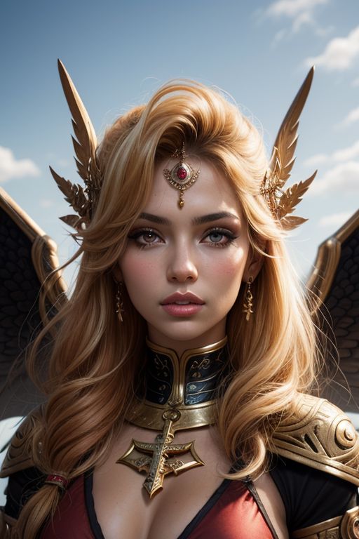 , solo, portrait of goodisis, goodnes ornate, egypt, energy, aura, dust, debris, Face looking, tanned skin, women, Ankh Cross, wings, ankh, Black Eyeliner blond light blue skin Red hair red army - dark elf lineage 2