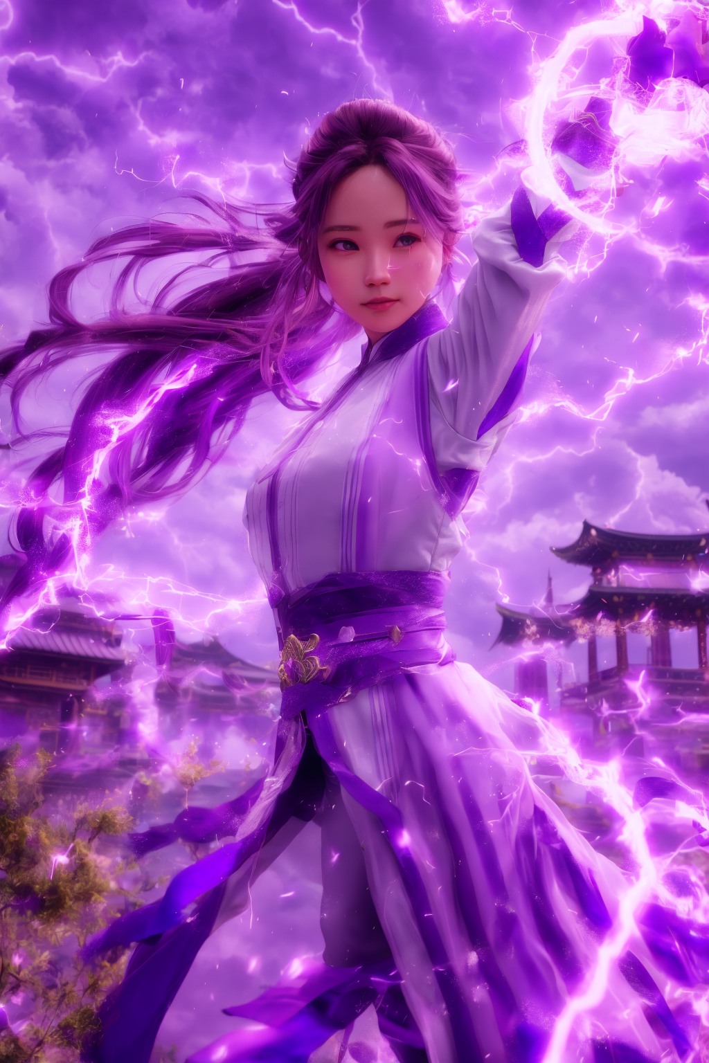 purple-lightning-aura,using purple-lightning-magic,purple-lightning-magic,ancient-costume,dancing,fighting stance,1girl,solo,long hair,brown hair,<lora:magic_fighting_purple_512_dreamshaper_8:0.8>,