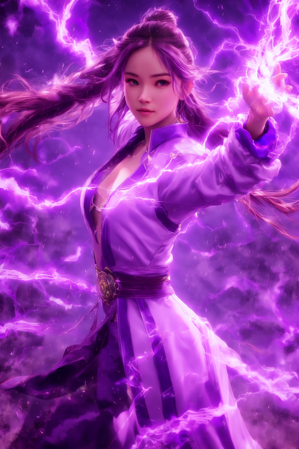purple-lightning-aura,using purple-lightning-magic,purple-lightning-magic,ancient-costume,dancing,fighting stance,1girl,solo,long hair,brown hair,<lora:magic_fighting_purple_512_dreamshaper_8:0.8>,