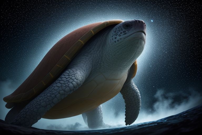 (((world turtle, swimming, immense power, wisdom, mythology, ancient civilizations, legends, shell, constellations, creation, stars, secrets of the universe)), mythological creature, majestic, ancient, slow movement, cosmic, celestial, astronomical, (whispers of the stars, mystical, enigmatic, powerful, profound, majestic creature, cosmic background, celestial lighting, dramatic composition, grandeur, majestic angle), HD, ultra high resolution, high quality, trending on ArtStation, professional artwork)