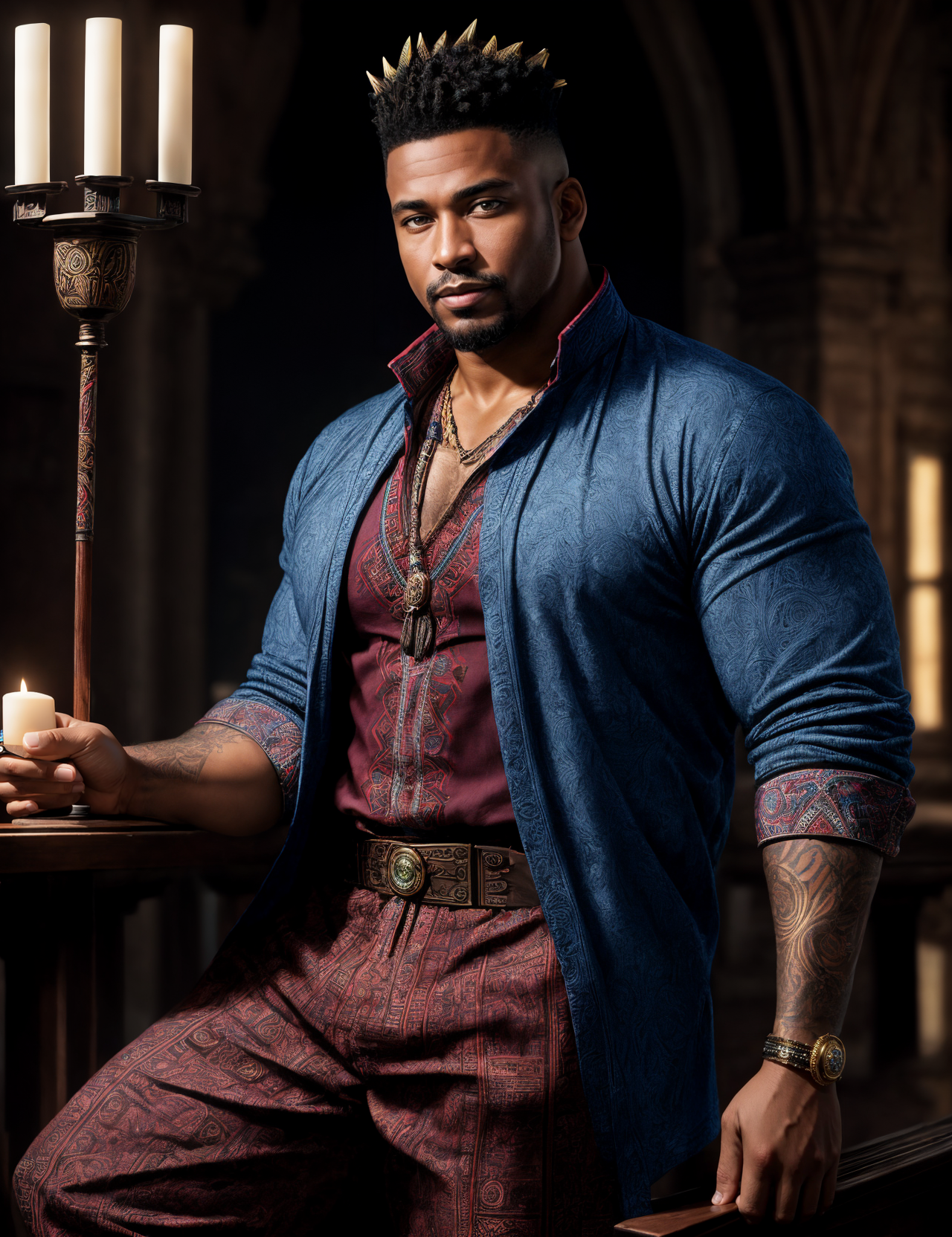((best quality)), ((masterpiece)), ((realistic)), (detailed), male Senior Full-figured, Afro-Caribbean, Deep blue eyes, , Orchid Mohawk hair, Awe, wearing Burgundy Aztec Barkcloth Straight-leg chinos, Paisley Flannel Henley shirt, Derby shoes, , and and, Hands holding an object delicately, showing care, City Halls, Slate, Torches (Traditional or Modern), Rim Lighting, ((masterpiece)), absurdres, HDR, <lora:add_detail:1>, <lora:LowRA:0.5>
