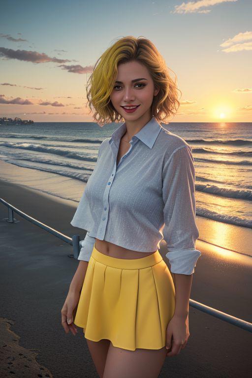 1Female. (smiling). Perfect eyes, highly detailed beautiful expressive eyes, Detailed eyes. Eyeliner. ( low-cut lingerie and mini skirt:1.2). Busty. Wavy hair in voluminous side flip, wet look. (Standing on a sidewalk, beach in the background, sun setting, seaside atmosphere:1.2), (looking at viewer:1.2), (cinematic shot:1.3), (award winning modern photography), sexy, mini skirt, realistic, 23yo, short hair, perfect face, yellow hair, blue eyes, low-cut, realistic, ultra hd, fit boddy,goose_fit_girl, russian girl, 8k, realistic face, best face,
