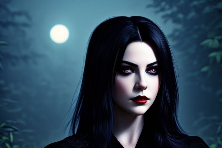 Sexy female goth vampire with red eyes and very long very wavy dark brown hair, centre of screen, vampyre dreams, moon, RBG lights, lifelike, misty forest in the background