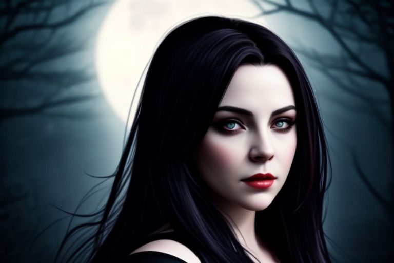 Sexy female vampire with red eyes and very long wavy brown hair, centre of screen, vampyre dreams, moon, RBG lights, lifelike, misty forest in the background