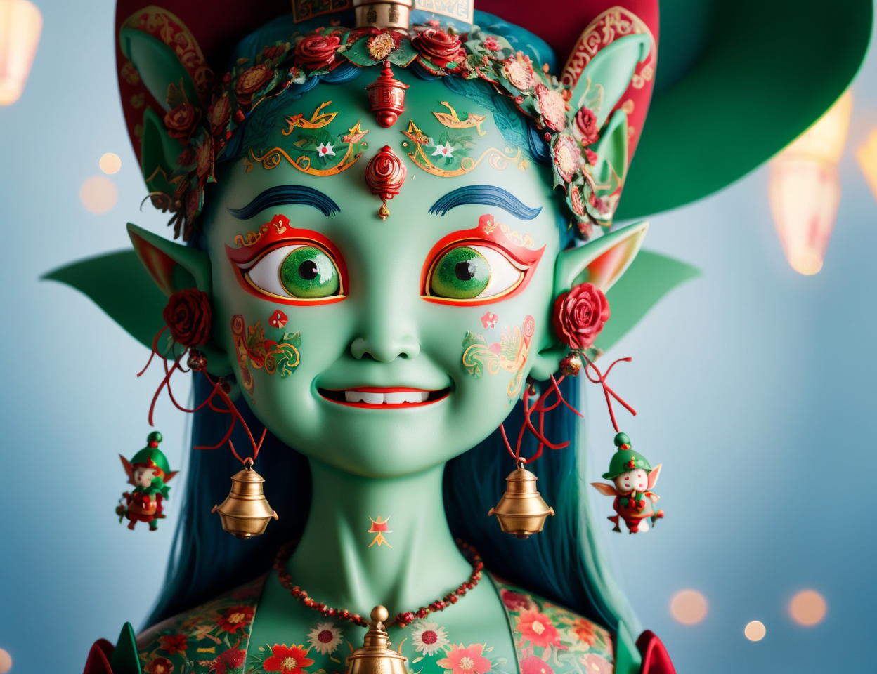 masterpiece illustration, detailed, hires, octane rendering,DonMH4ny4 manananggal, small humanoid creature, pointed ears, bright and festive attire, red, green, holiday colors, pointed hat with a bell on the tip, merry cheerful expression, rosy cheeks, lively eyes, joyful, industrious, and benevolent, task,outdoor activities,Gloomy,inclusive,group activities <lora:DonMH4ny4:1>