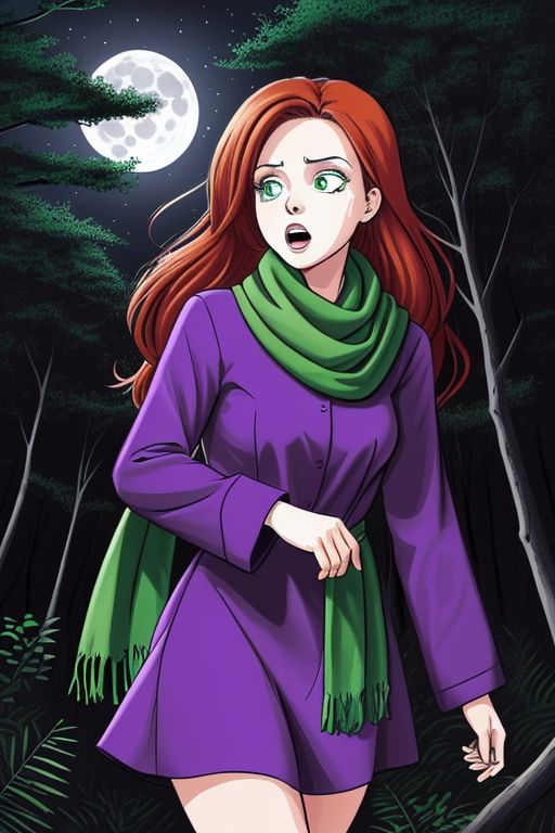 (cartoonish style), simplified drawing of a cute woman, long auburn colored hair, wearing (green scarf), wearing long sleeve (purple colored mini dress), creeping through a scary forest (at night), looking away, mouth open, looking worried, expressive face, detailed face, (eyes wide open), perfect eyes, (perfect hands), jagged tree branches, moonlight, creepy, (dark), flat colors