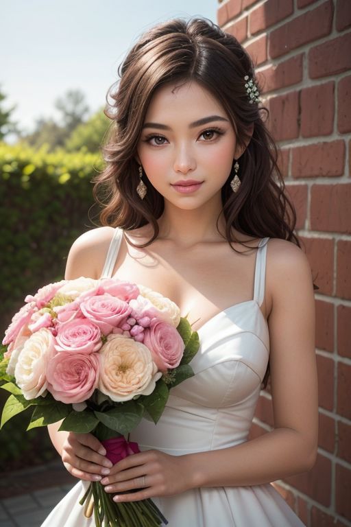 a beautiful girl holding a huge bouquet consisting of soft pink gypsophila flowers and balloons of various shapes, mostly in the form of hearts. The balloons are decorated with satin ribbons, which gives the composition additional elegance. Flowers and balloons are wrapped in lush pink packaging with a layered effect. The background of the image shows a brick wall and parts of greenery, which creates a contrasting and bright background for the bouquet.High quality, professional photo, 32k Photography is professional in style. bright lighting,bright colour scheme bright colour,detailed high detail style,majestic,photorealistic,HD,8k close-up 4K cinematic light,hyper-realistic,photorealism,fresh detailing