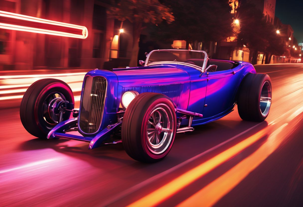 (masterpiece, best quality, ultra-detailed, 8K),50s retro style with modern neon aspect, 1932 Ford Roadster Hot Rod, street racing inspired, LED, ((Twin headlights)), (((Bright flame paint job down the sides of the bright red body of the car))), (Black racing wheels), Wheelspin showing motion, Show car in motion, Burnout, masterpiece, best quality, realistic, ultra highres, (((depth of field))), (full dual colour neon lights:1.2), (hard dual color lighting:1.4), (detailed background), (masterpiece:1.2), (ultra detailed), (best quality), intricate, comprehensive cinematic, magical photography, (gradients), glossy, Night with galaxy sky, Fast action style, fire out of tail pipes, Sideways drifting in to a turn, flame paint with on candy apple metal flake red painted body, aesthetic,intricate, realistic,cinematic lighting,