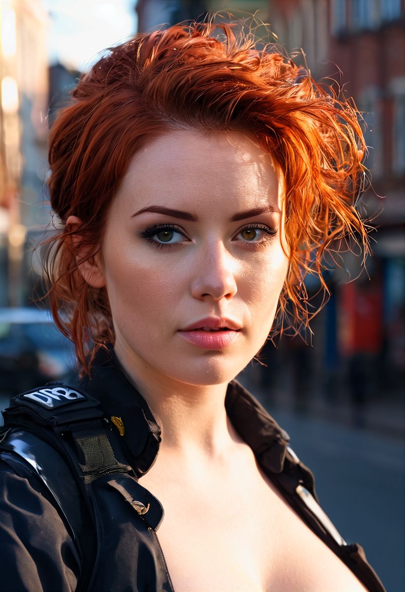 NSFW candid amateur photo, partial nudity, (best quality, high quality, sharp focus:1.4), beautiful european police officer, (natural red hair: 1.1), Irish, striking makeup, seductive, stripping, bare skin, cleavage, tactical vest, radio, uniform, scared, goosebumps, freezing cold, empty street, film, bokeh, professional, 4k, highly detailed, fujifilm XT3, dark, analog photo, deep shadows, by ilya kuvshinov