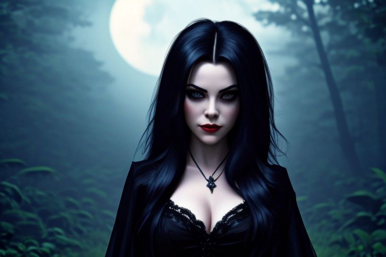 Sexy female vampire with red eyes and very long wavy brown hair, centre of screen, vampyre dreams, moon, RBG lights, lifelike, misty forest in the background