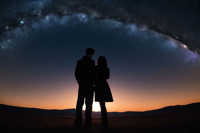 A man and a woman standing with their backs to the camera, side by side, The scene is set under a breathtaking night sky with a narrow strip resembling a segment of Saturn's rings, starting from the center of the frame and tilted to the right at a 30-degree angle from the vertical. The image is in silhouette style, the couple appear as dark shapes against the bright, starry background. sense of greater distance and vastness. Use a wide-angle camera to capture the scene. cinematic light, vibrant colors