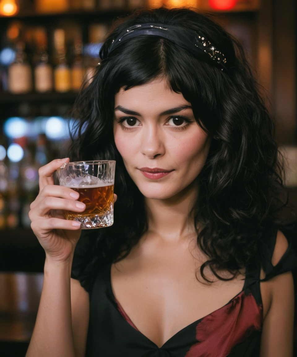 closeup face portrait,uotuatyerdua is holding a shot glass full of whiskey close to her face,in a bar,tuxedo,long silky straight black hair,hairband,smirk,high quality photography,high detailed defined skin pores,detailed irises and pupils,sharp focus,dynamic lighting,moody,film grain,film,Cinematic,Canon EOS R3,4k textures,8k resolution,<lora:Audrey Tautou SDXL:1>,<lora:MJ52:0.2>,