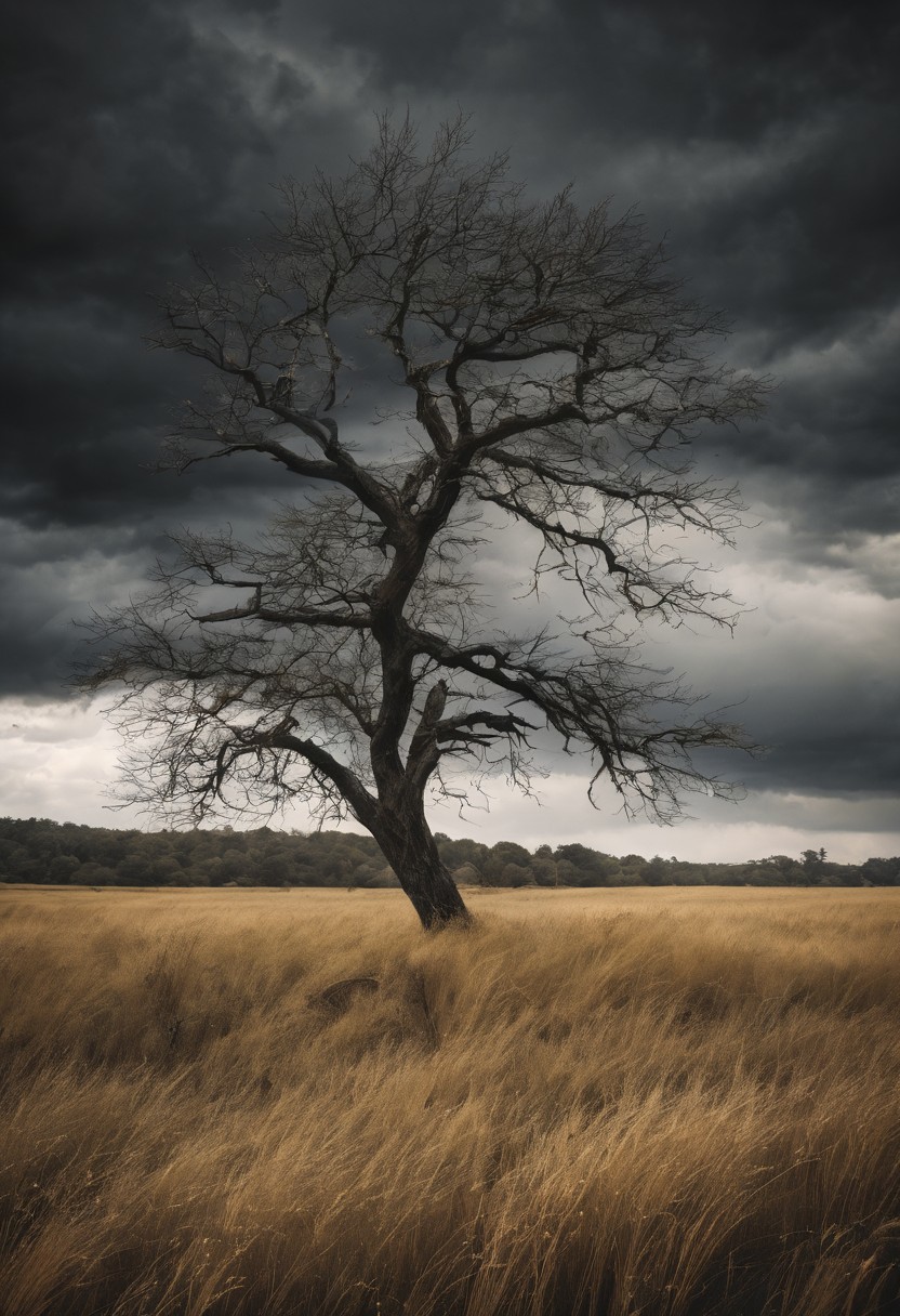 A high-resolution, dramatic photograph of a lone tree standing in the middle of a golden field of tall, swaying grass. Above, dark, stormy clouds dominate the sky, with a break in the clouds allowing a glimpse of light to shine through, creating a striking contrast between the dark sky and the illuminated landscape. The scene is moody and atmospheric, evoking a sense of impending storm and the beauty of nature's raw power. The tree, with its gnarled branches and dark leaves, stands as a focal point against the vast, turbulent sky.