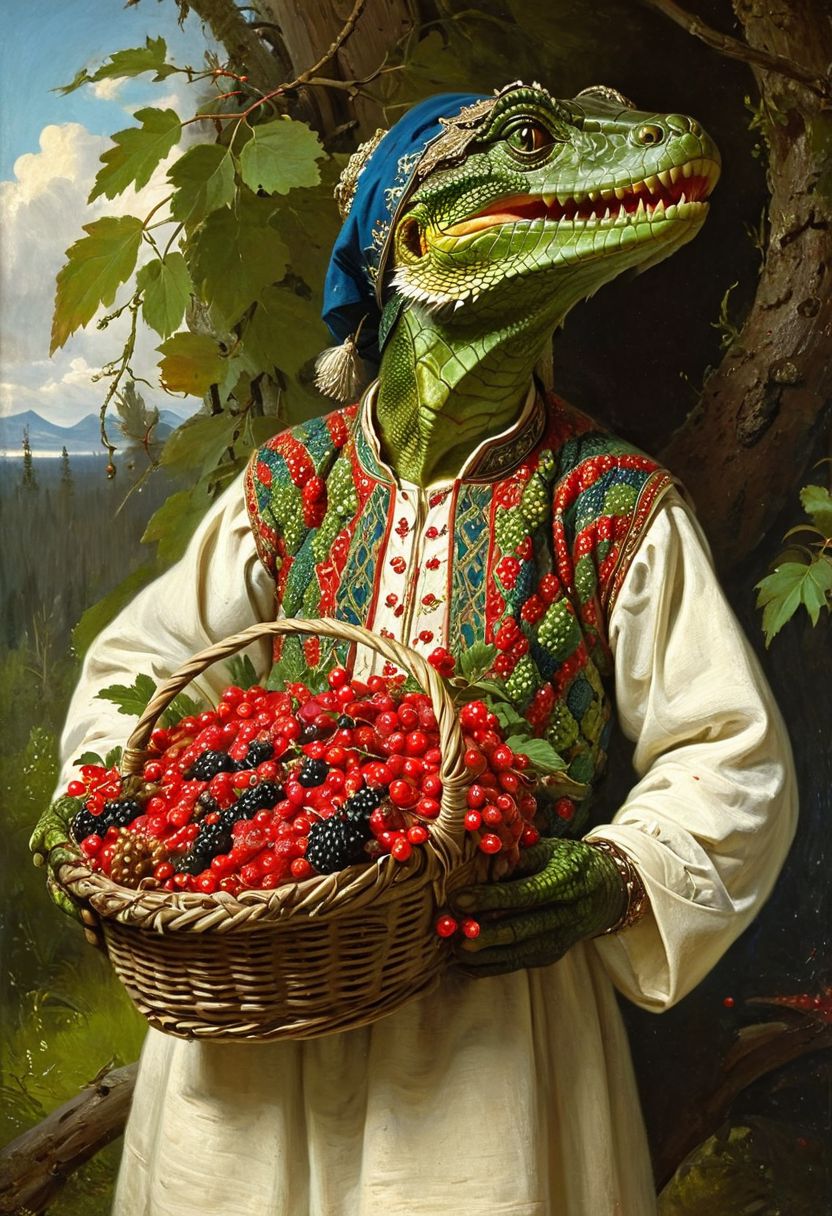A lizardman holds a basket of berries in its mouth, from side, traditional russian clothing, long-range plan, oil on canvas, by Ivan Shishkin, <lora:ClassipeintXL1.9:0.2>, ,best quality, high resolution, extreme detail, outstanding composition, masterpiece,