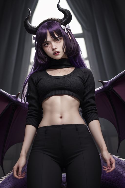 (masterpiece, best quality:1.4), dark purple virgin destroyer sweater, masterpiece, high quality, highres, 1girl, solo, <lora:ishmael-limbus-v4-wasabiya:1> ishmael, very long hair, dark purple hair, dark purple eyes, freckles, dark blur hairband, dark crimson hair bow, standing, solo, solo focus, one person, female, flat chest, flat breasts, small breasts, yandere eyes, claws, fangs, purple dragon tail, black dragon horns, dragon girl, empty hands, wide hips, looking on viewer from below, looking with hate, angry, tomboy, androgynous, pale skin, <lora:virgin_destroyer_sweater_v0.4:1>