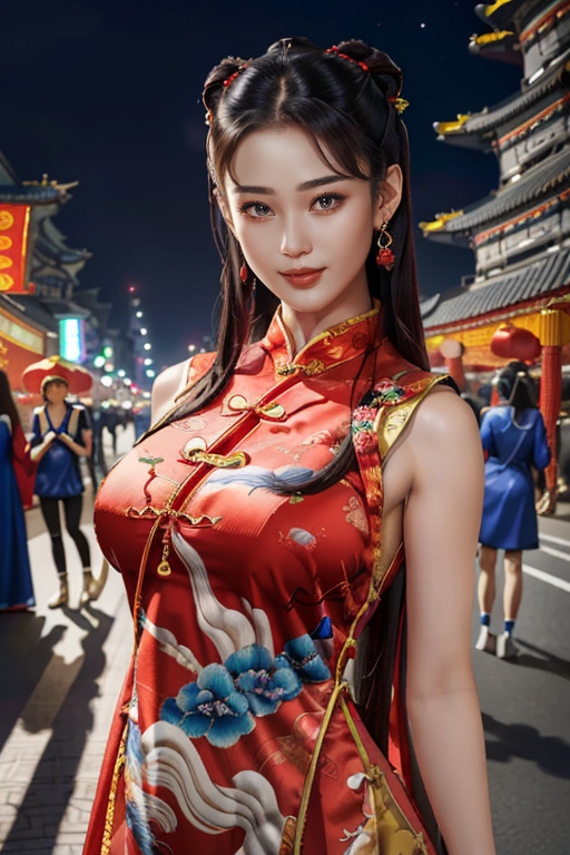 (flirtatious ,seductive:1.4),(RAW photo:1.2),(photorealistic:1.6),(lens 135mm,f1.8:1.2),(ultimate quality, masterpiece:1.3),(intricate details:1.2,(detailed face:1.2),dramatic,photograph,(upper body:1.6),Sharp focus, (1girl,solo,night time,outdoors,street,looking at viewer,chinese dress:1.6) confident smile,beautful face,(large breasts, narrow waist),sexy body,perfect body,pov legs,shiny hairs,hair ornament,earrings,necklace,jewelry, <lora:張馨äºhinhdu:0.8:lbw=FACE>,