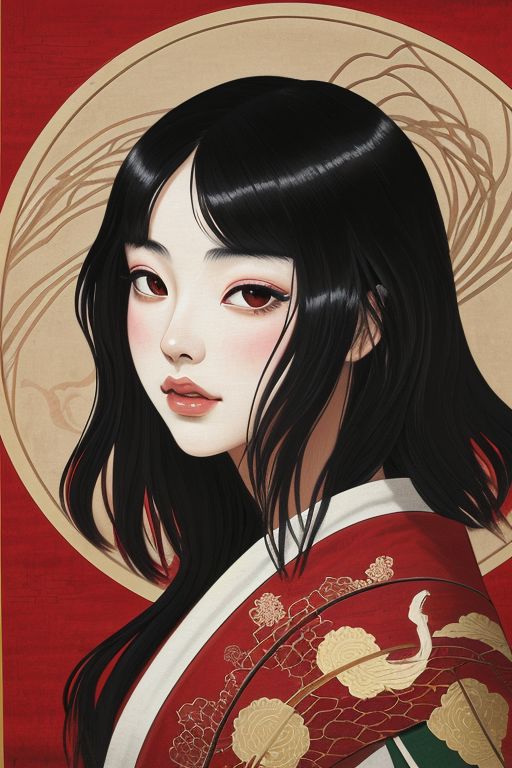 A 35 year old Asian , women , black hair , perfect body, ukiyoe, pinup, realistic, portrait, detailed, lifelike, chinese traditional painting, shunga, tibetan traditional painting, art nouveau, hanafuda, topless