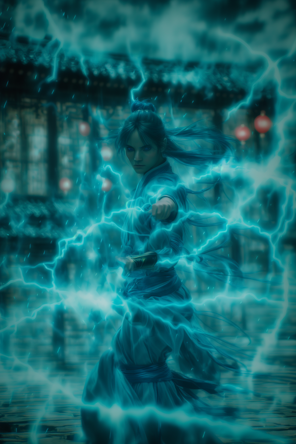 fighting stance,dancing,ancient-costume,cyan-aura,using cyan-lightning-magic,cyan-lightning-magic,using cyan-magic,cyan-magic,1girl,solo,long hair,blue eyes,<lora:magic_fighting_cyan_512_dreamshaper_8_3:1>,