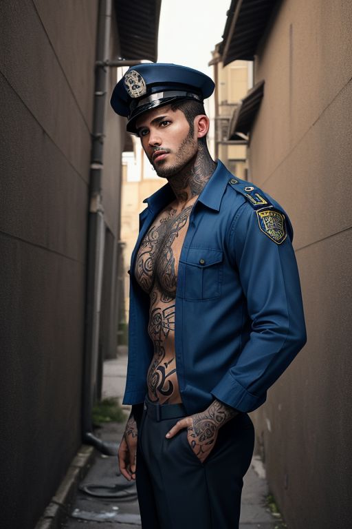 photo of a 40 year old handsome policeman standing in an alley, from side, hairy chest, trousers, (open shirt:1.2), pecs, tattoos, highly detailed, cinematic lighting, penis, <lora:Taking_the_piss:0.7> p1ss1ng