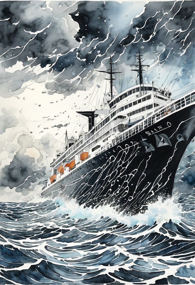 Hyper, quality, hyper detailed, extremely intricate, hyper maximalist, watercolor, <lora:Maximalist_Drawing_BW:0.74>, PStyl3, negative space, abstract, cloud system, storms, on deck of ship, storm tossed seas, ink
