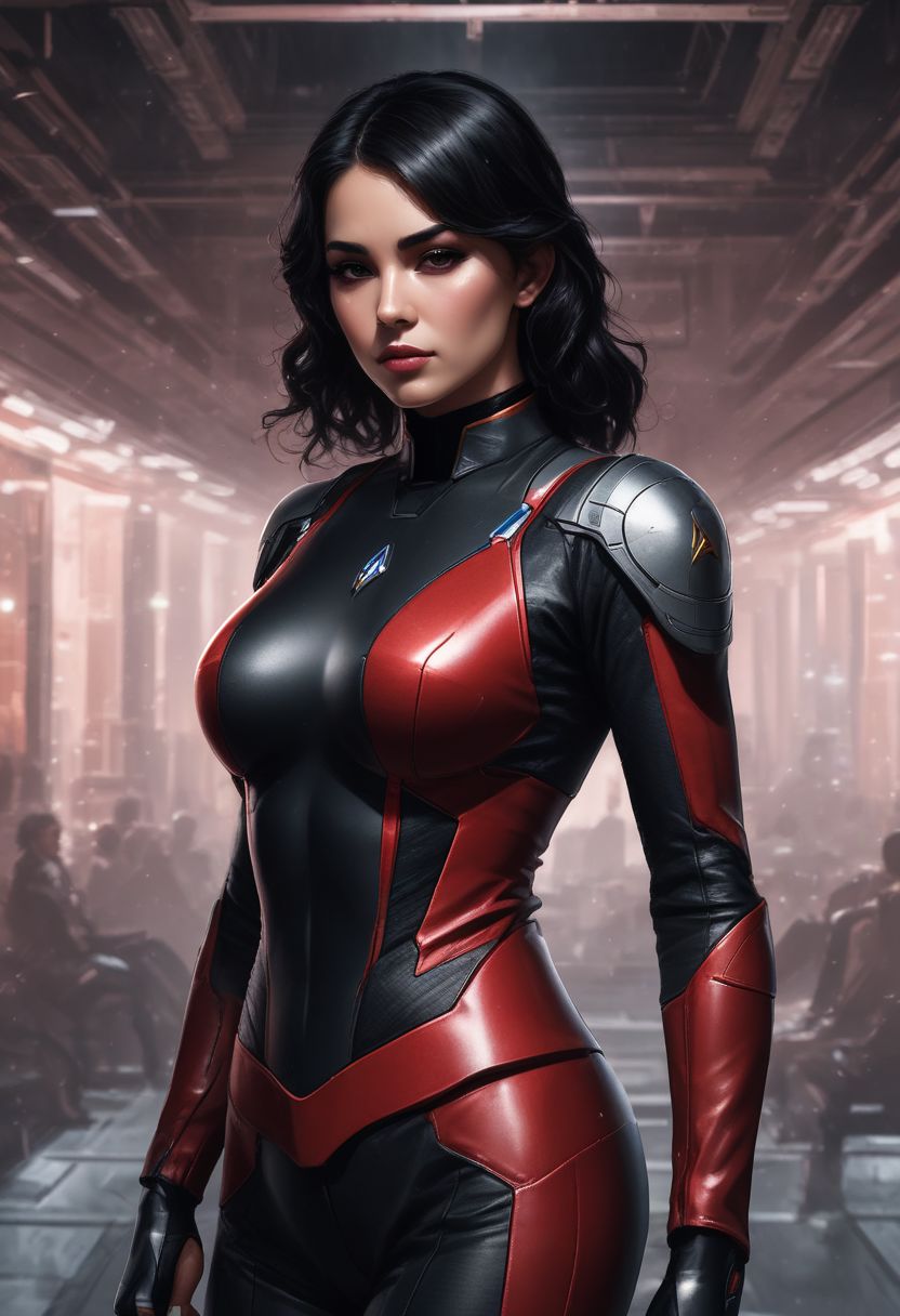 Starship Enterprise officer, which is a female originally from Guadalajara, Mexico, masterfully translated into a Star Trek style uniform combining elements of red and black, her uniform placed prominently on the bridge of the starship. Rendering in the genre of a hyper detailed character concept art by Artgem reminiscent of attractive girl beauty, her black wavy hair cascading onto her shoulders, sparking a dramatic allure, paired suspenseful atmosphere, cinematic lighting, Atrractive 21 years old woman, attractive, 8k resolution concept art portrait by Greg Rutkowski