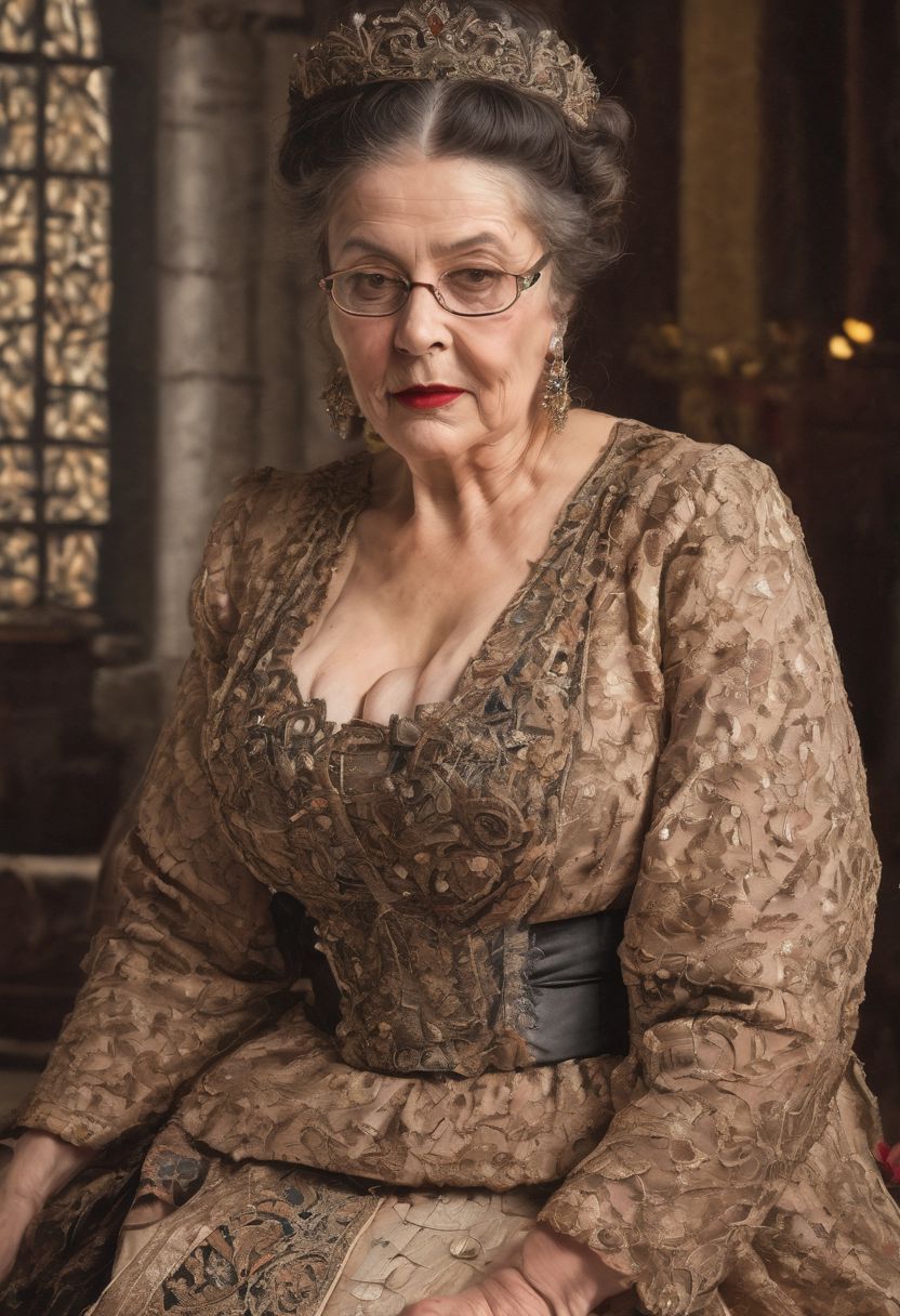gilf 60-Plus huge saggy boobs, very hairy vagina, high heels stilettos, sixty years old, voluminous black hair, hair bun, heavy makeup, full body, natural lighting, glasses, nerd, red lips, on all fours, dressed like a medieval princess