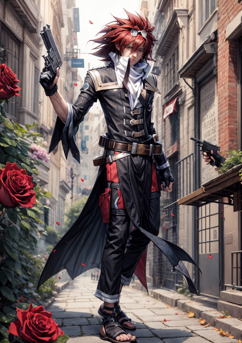 (masterpiece:1.2), best quality, masterpiece, highres, original, extremely detailed wallpaper, perfect lighting,(extremely detailed CG:1.2), drawing, paintbrush, solo, 1boy, male focus, flower, gun, rose, handgun, gloves, fingerless gloves, red rose, heterochromia, sandals, belt, holster, ragna the bloodedge, pants, spiked hair, <lora:add_detail:0.75> , <lora:lihui4JXK-b2-bf16-128-128-1-re1-ep3-768-DA-5015fix:1>