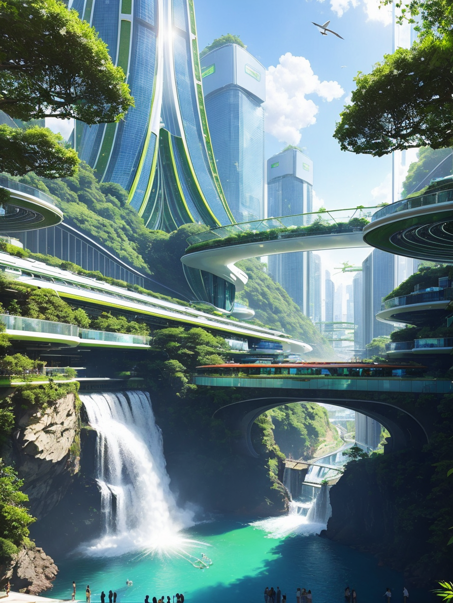 Solar-punk architecture, greenery, glass, utopia, pedestrian, perfect, white, green, blue sky, urban, pods, resort, curves, unique, original, tall, people, animals, water, waterfalls, monorails, birds, futuristic, city