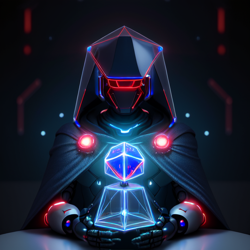 futuristic robot wearing a cloak with a large semi-transparent dodecahedron red and blue neon infinity mirror as its head, Professional photography, bokeh, natural lighting, canon lens, shot on dslr 64 megapixels sharp focus"