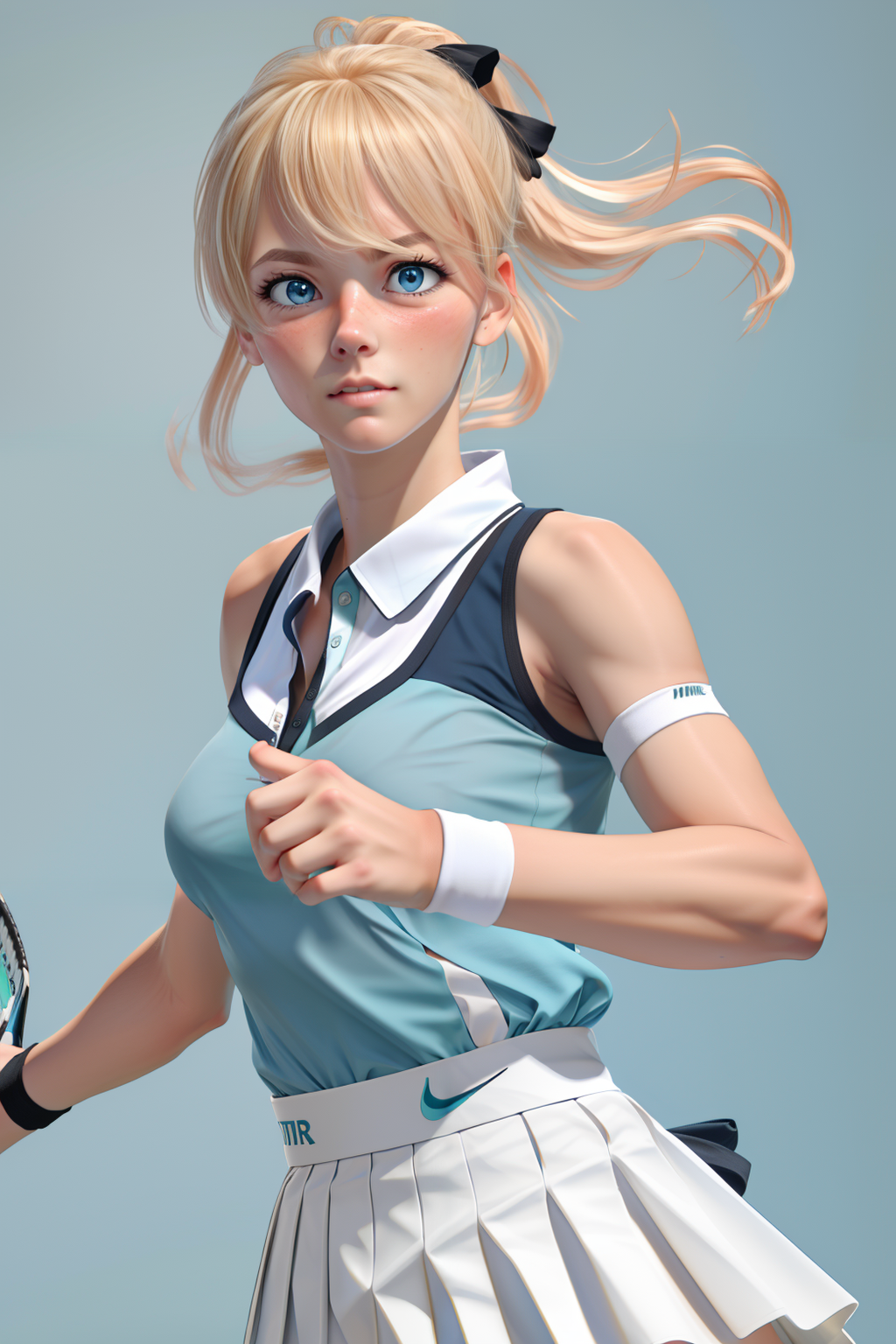 masterpiece, best quality, highres, 1girl,<lora:jean:1> , wearing Nike tenis outfit, <lora:Shinyskin-000018:0.5> , teal shirt, white pleated skirt , blonde hair <lora:hairdetailer:0.7>, sweating, blue eyes, 25yo, ponytail , black ribbon, shirt collar, wristbands , tennis racket, breasts, 3DMM <lora:3DMM_V12:0.7>