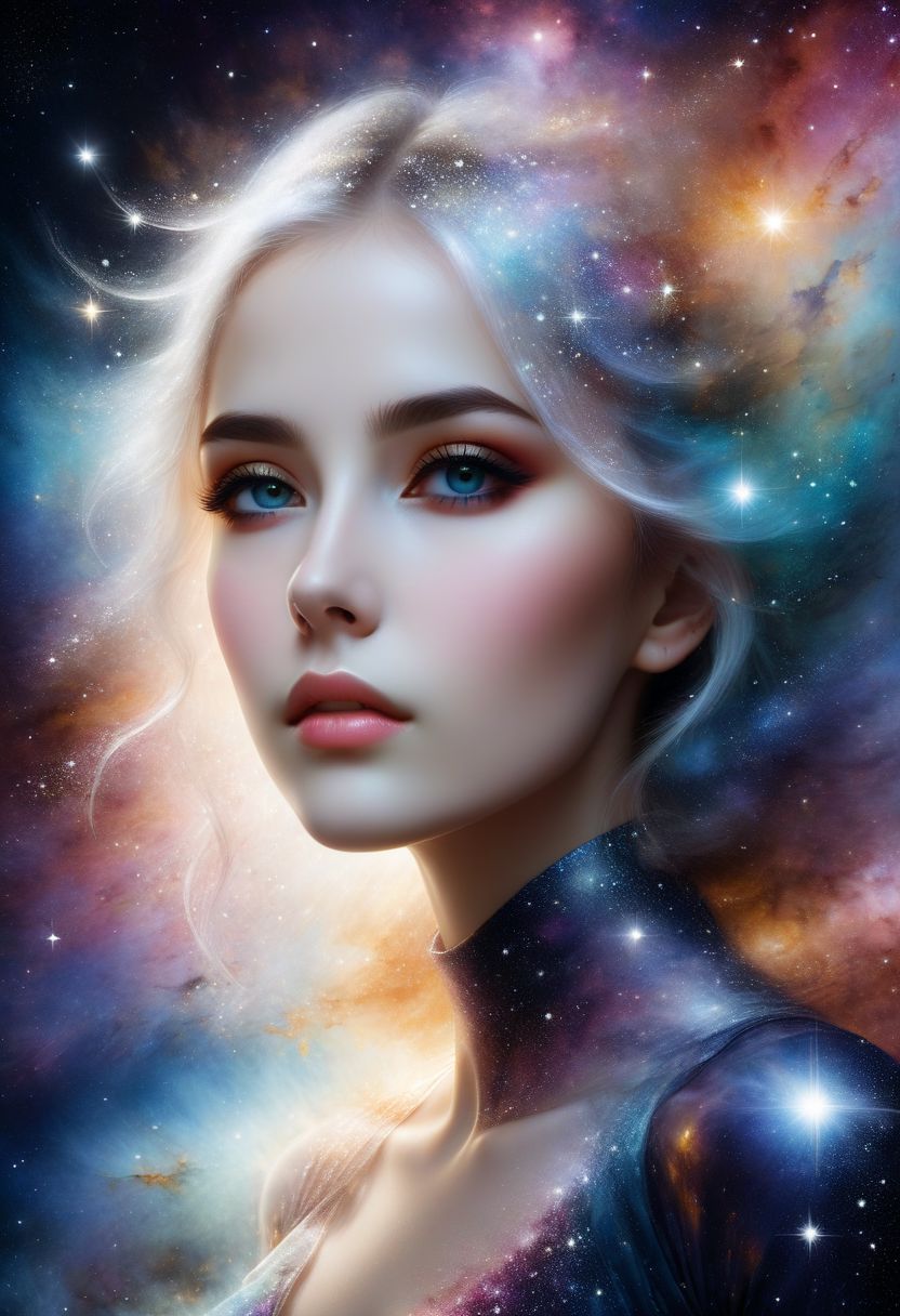 masterpiece (highest quality: 1.4). on a black background, a transparent, translucent, barely distinguishable white figure consisting of individual white dots, colorless. Against the background of the Galaxy flying in all directions, the transparent white slender figure of a romantic, very beautiful woman with European features, loose hair and large expressive almond-shaped eyes appears. The face consists of stars and a stellar nebula, it is transparent, distant stars shine through it. Beautiful lips, shining eyes, eyelashes and a thin neck are clearly visible. A fantastic, mystical, colorful high-resolution color shot. soft tones. Fantasy. Dynamically.