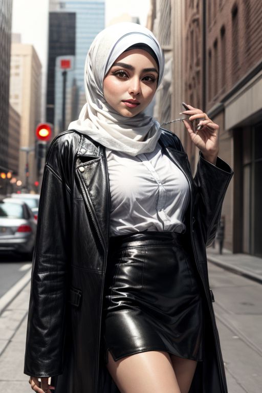 hijabi girl, Hijab Style, (black leather skirt, open coat, white shirt), cowboy shot,