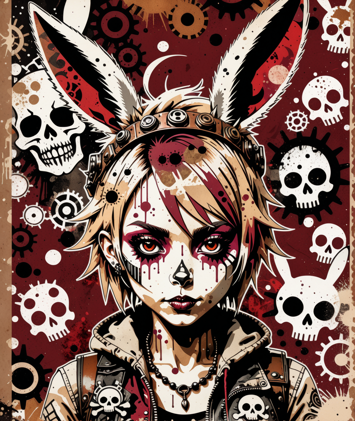 4k resolution, best quality, masterpiece, intricate details, OverallDetailXL, tiny tina with rabit ears <lora:Punk Collage:1> punk collage, ink splashes, ink drops, fragmented, overlapping textures and elements, urban, contrast, grunge, skulls and gears, copper tones, ivory tones, dark red tones, borderlands style,