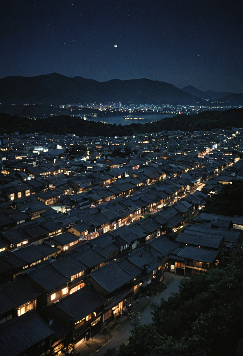 cinematic scene of Akira Kurosawa's movie in uncivilized Japanese townscape viewed from the hill, Edo period, aesthetic landscapes, cinematic nighttime, (photo-realistic:1.2), clear sky, high-angle shot, high image quality by digital remastering, vivid colors, highly detailed
