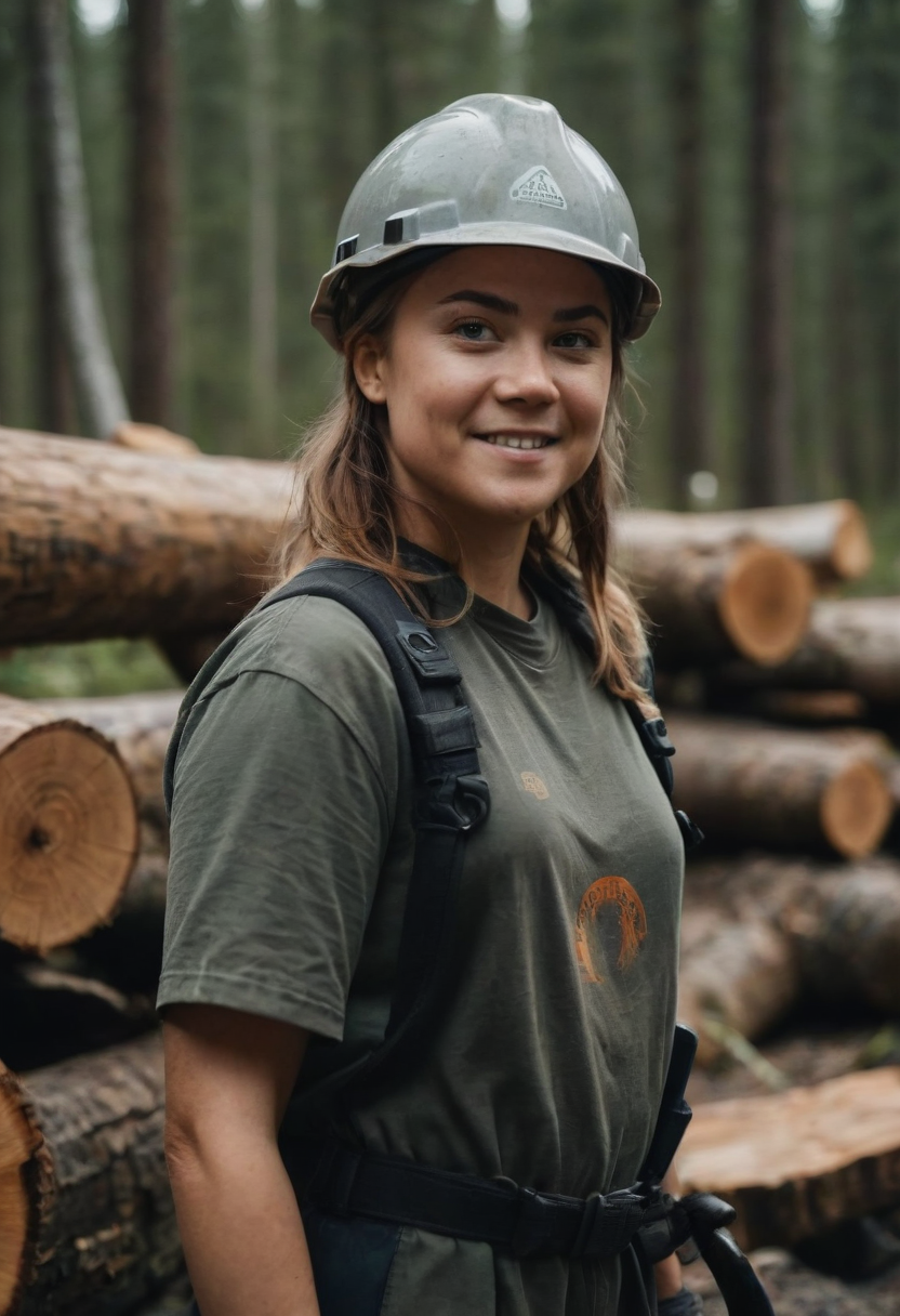 photo in the style of Alessio Albi,greta is a logger working in Alaska,crazy_smile,holding a large axe,wearing loggers safety gear,wearing hard hat,Cinematic,high quality photography,4k textures,8k resolution,Canon EOS R3,<lora:greta:0.8>,