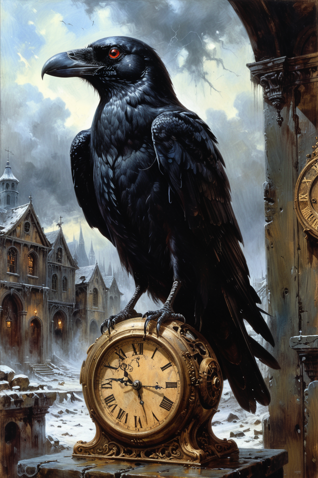 score_9, score_8_up, score_8, score_7_up, (best quality), masterpiece, absurdes, surreal, oil painting, illustration, traditional media, very aesthetic, solo focus, (a crow is sitting on top of a clock:1.2), glistering feathers, beak, glowing red eyes, dramatic sky, rainy, contrast background, Intricate and detailed concept art, gothic art, sad, very realistic, (no humans:1.5), heavy brushstrokes, highly and intricate details, gloomy, unsetting, tragic, dark fantasy, victorican, renaissance, darkness, chiaroscuro, glowing, contrast lighting, dark and mysterious atmosphere, suspenseful, the grim atmosphere, melancholy, sorrowful, Perfect composition, Sharp focus, dramatic lighting and cinematic lights by Ridley Scott, dramatic angle, unique perspective, unique angle, color contrast, artistic, <lora:sdxl_lora_beksinski:0.5> digital artwork by Beksinski <lora:HR_Giger_Style_Pony:0.5> edgar allan poe, Ken Kelly, Marek Okon fixl-art(creative), OverallDetailXL <lora:Psychedemon:0.35> <lora:tbh233-sdxl:0.4>